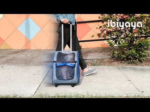 The Ibiyaya New Liso Backpack Parallel Transport Pet Trolley in Slate/Sapphire is an interchangeable pet carrier bag that can be used as a backpack or stroller and features mesh windows for ventilation and 360° swivel wheels.