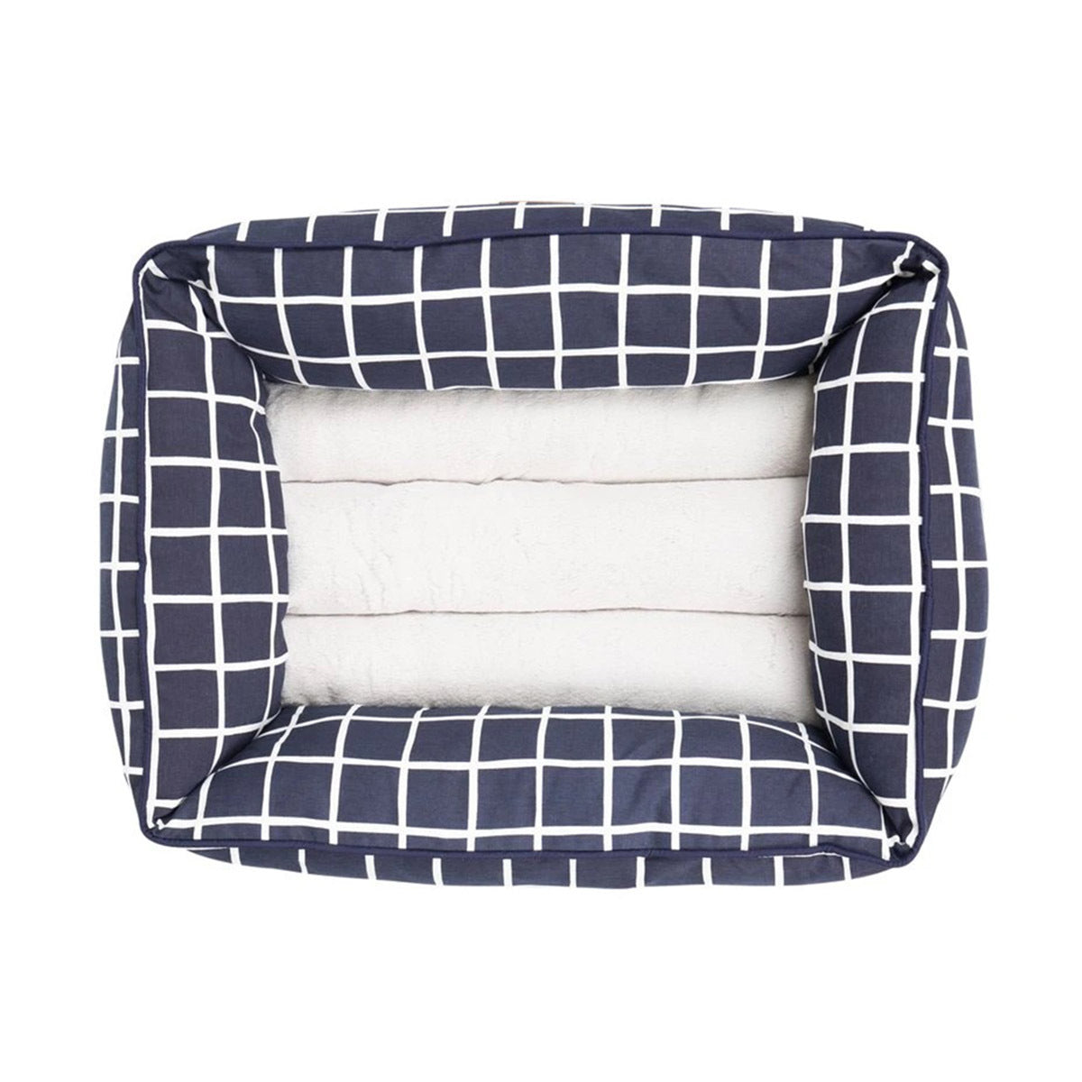 The exterior uses a 100% cotton printed canvas in a classic navy check pattern, while the base is non‑slip to keep the bed steady on hard floors.