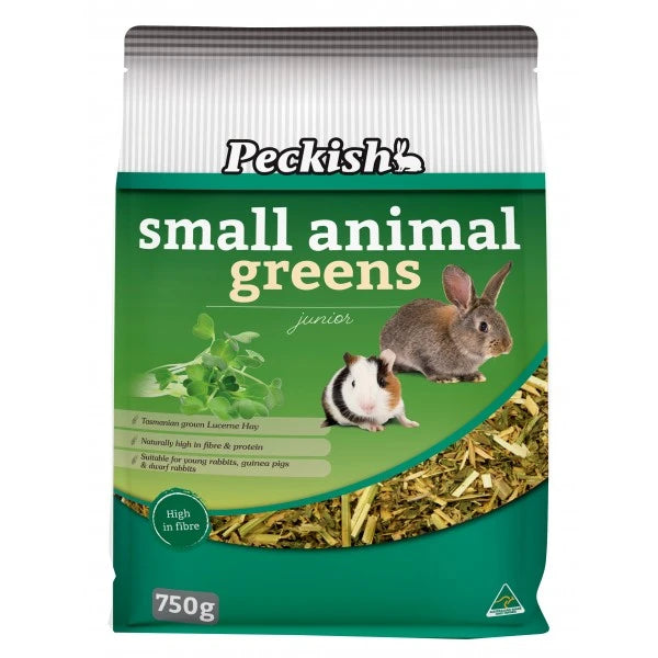 Peckish Small Animal Greens are an important dietary staple for young, growing rabbits and guinea pigs (up to 12 months old) as well as dwarf rabbits. It can also be fed in conjunction with other grass hay to adult rabbits and guinea pigs. Made from Lucerne Hay grown in Tasmania, this feed is naturally high in fibre, protein and calcium.