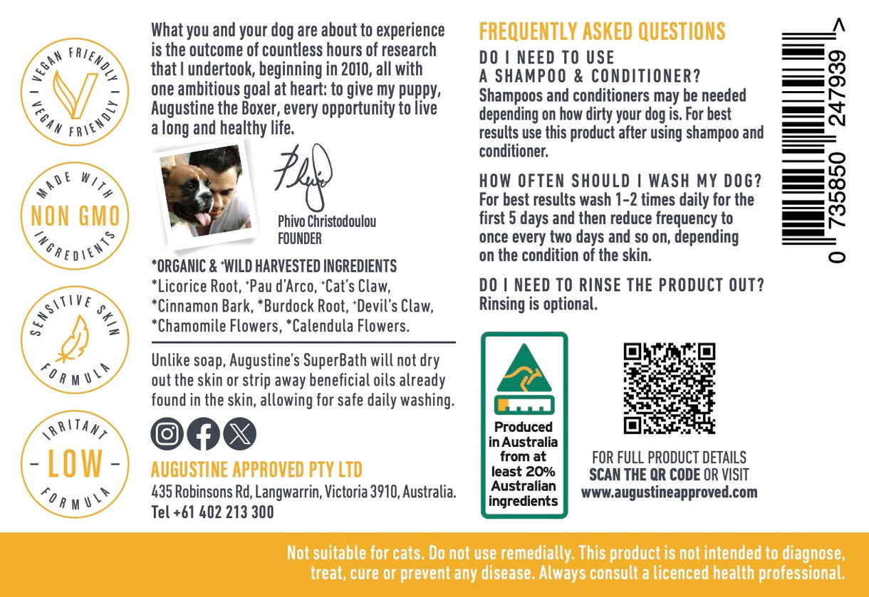 Unlike soap, Augustine’s SuperBath will not dry out the skin or strip away beneficial oils already found in the skin, allowing for safe daily washing.