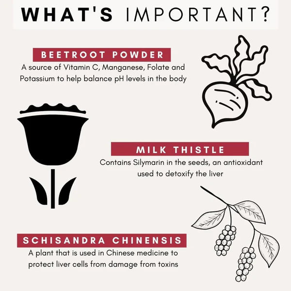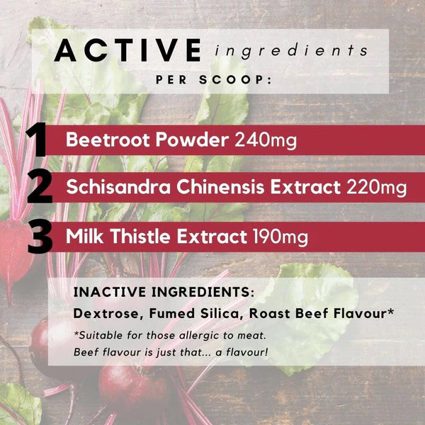ACTIVE: Beetroot Powder 240mg, Schisandra Chinensis 220mg, Milk Thistle 190mg. Inactive: Dextrose, Fumed Silica, Roast Beef Flavour