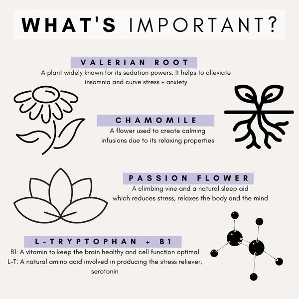 ACTIVE: Withania Somnifera Extract 50mg, Vitamin B1 25mg, L-Tryptophan 20mg, Magnesium 17mg, Chamomile Extract 15mg, Valerian Root Extract 12mg, Passion Flower Extract 10mg. Inactive: Dextrose, Fumed Silica, Fish Flavour*.