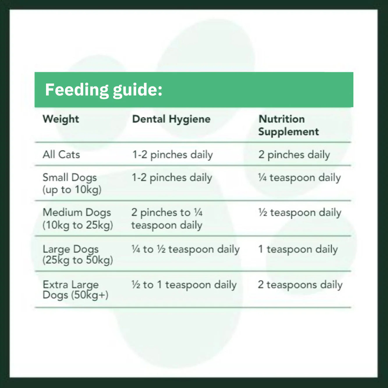 Giant Dogs (50kg+) – ½ to 1 teaspoon